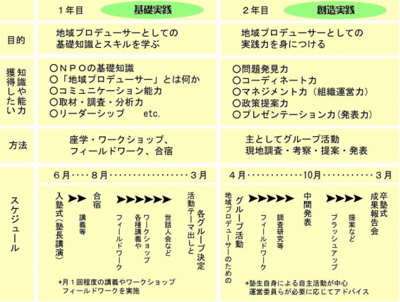 「あいち未来塾」地域プロデューサー形成事業として、単発のリーダー養成講座でなく、2年間をかけてじっくりと地域プロデューサーが育っていくための塾として位置づけています。